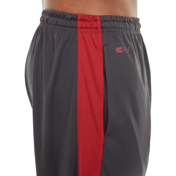 • Dark gray shorts with red accents.