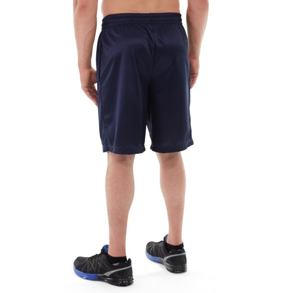 • Navy polyester pinstripe shorts.